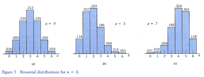 當 p=.5 時圖形是左右對稱的, 當 p>.5 或 p<.5 時機率分配圖形即成不對稱.